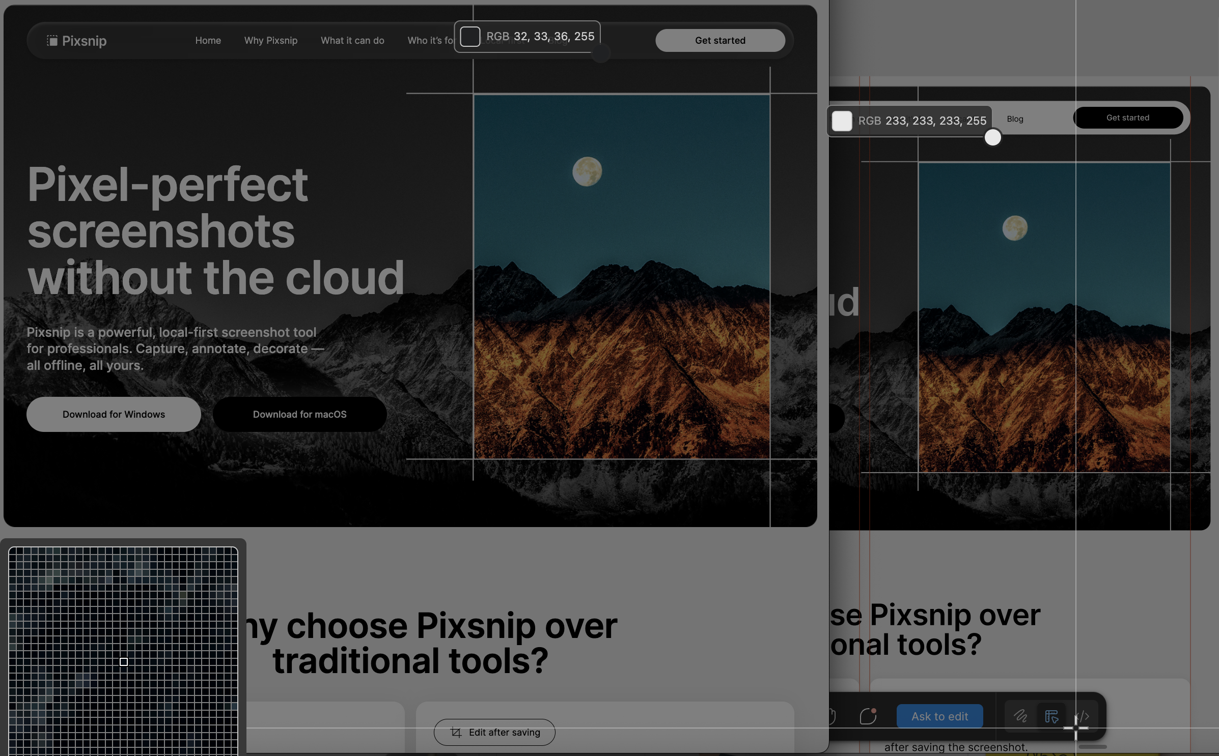 Whether you're preparing a UI review, editing screenshots for documentation, or just grabbing colors for your style guide — Pixsnip makes it smooth.