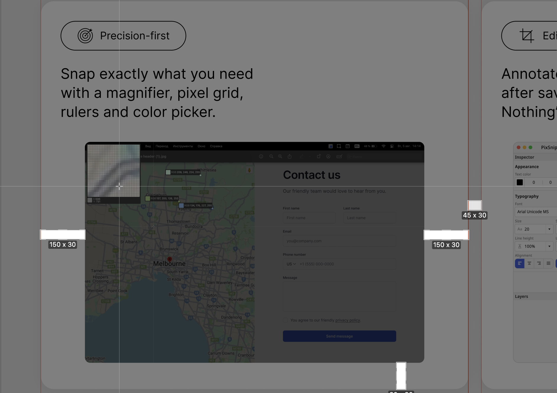 Pixsnip is a local screenshot and annotation tool that’s built for visual precision. It includes a native pixel ruler you can use directly on any screen or captured image.