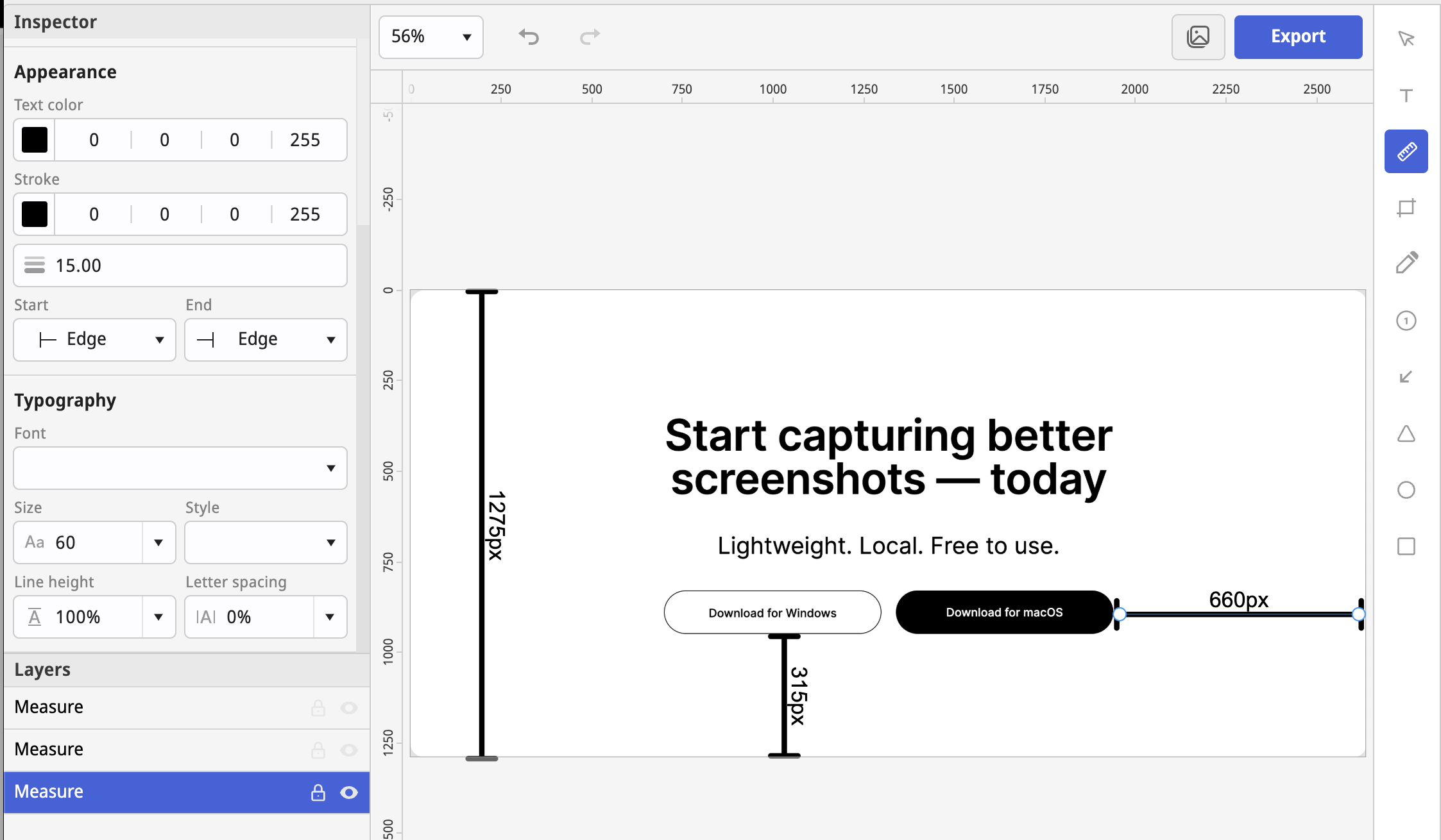 After taking a screenshot, just activate the ruler and drag between two points on screen. Instantly see the pixel distance — horizontal or vertical.