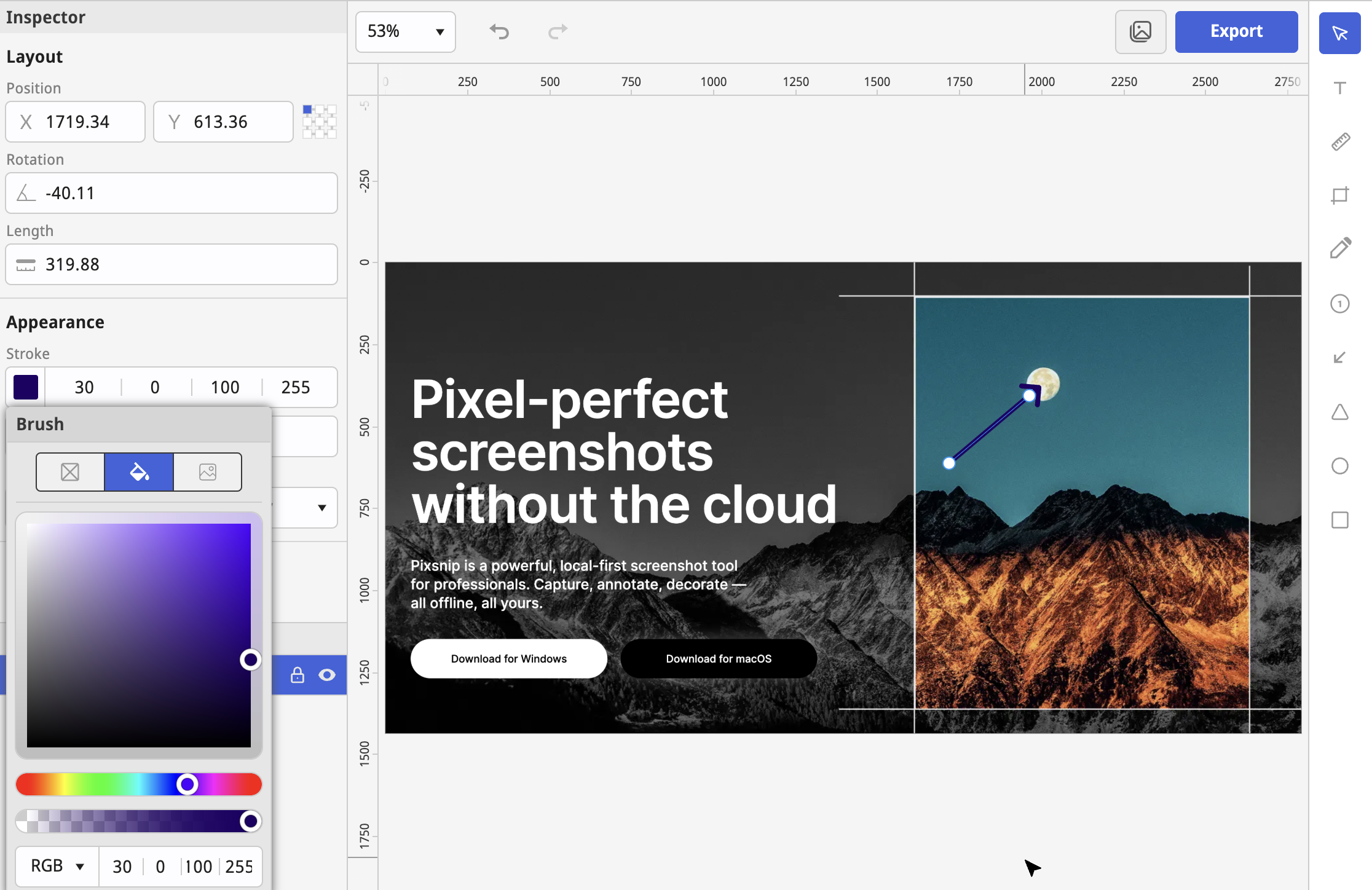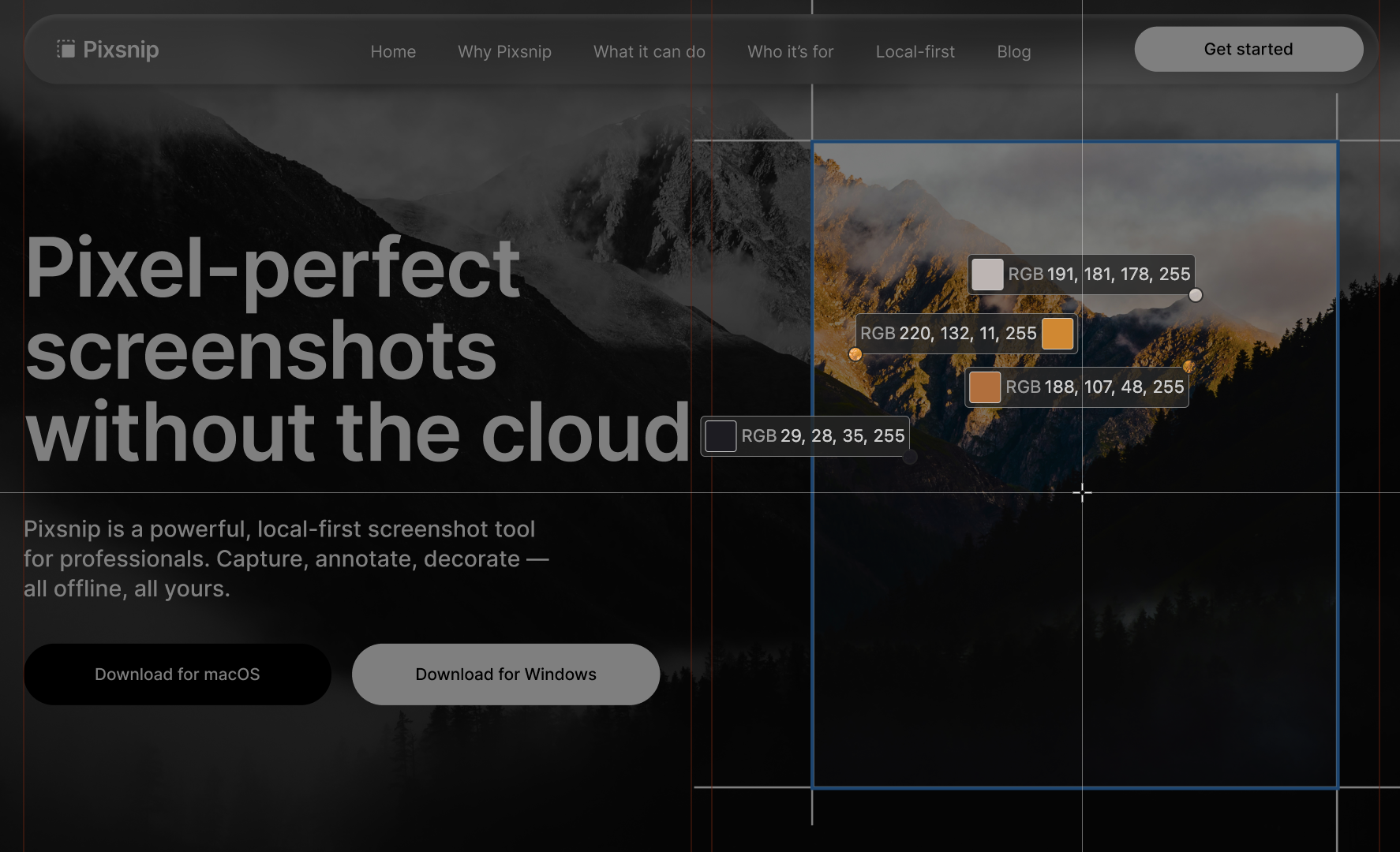 With Pixsnip’s built-in color picker, you can hover over any pixel on your screen — in any app — and instantly grab the HEX or RGB value. You can even pick from paused video frames, system UI, or other design tools.